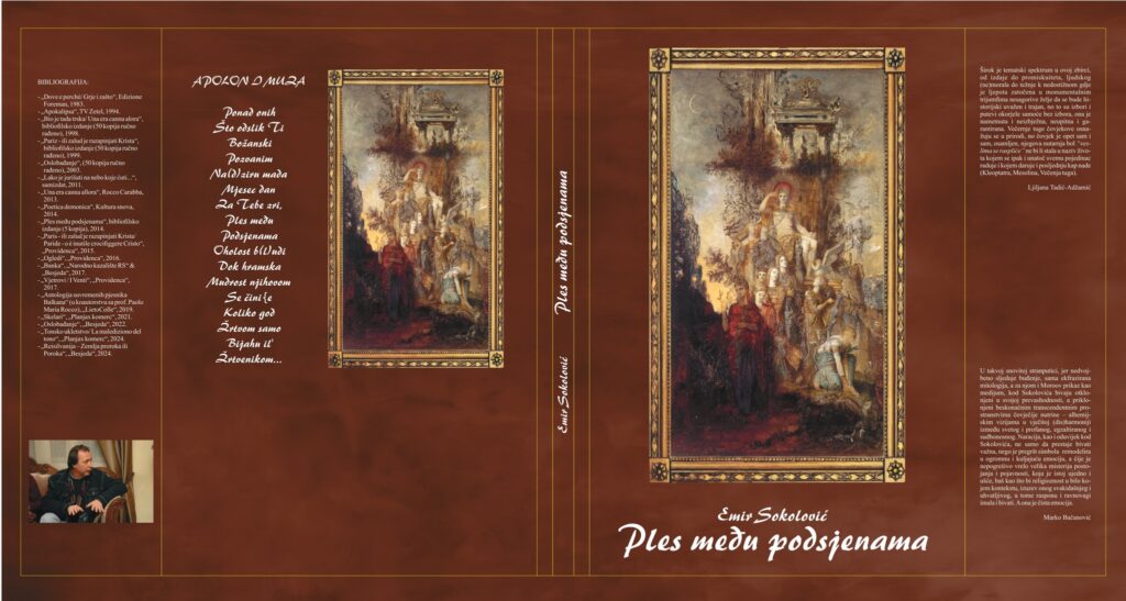 Ovo je formatom velika knjiga, A4, dakle i široko i prostrano. Štampana bogato bojom, na masnom sjajnom debelom papiru. Tvrde korice pa opet lijep papirni plašt oko njih podsjećaju na knjige koje su se nekada ovako pravile, za uživanje čula, za prijatno držanje teške i tople knjige u rukama. Ovo nije knjiga koja se čita od korica do korica, u jednom dahu, ovo nije priča, ovo je ples među podsjenama. Ovo je knjiga za gledanje i čitanje, za potragu i snatrenje. Kada gledate neku od Moroovih slika sa lijeve strane prati vas Sokolovićeva pjesma sa desne, vi tada čitate pa gledate, pa opet čitate sve dok i sami ne počnete da u svojoj glavi pjevate i slikate svoje slike i svoje pjesme koje su iznjedrene simbolima koje vidite i čitate. Da, simbolima. Nije slučajno zašto je to u stvari Moro u Sokolovićevoj inspiraciji, veliki slikar simbolizma, možda i najveći, čija platna odišu univerzalnim temama od antike do biblijskih tematika, dakle od stvaranja svijeta ili svijetova. O vremenima koja su prešla u snove i sjene i odjeke kojih više nema, ali bez kojih se ne može. Slično Morou, i Sokolović pleše po podsjenama simbolike i onovremnog i univerzalnog u Moroovim slikama, ali ipak donoseći mnogo toga svoga. Nije prvina Sokoloviću da se poigrava stilovima pa moglo bi se reći i eksperimentima u umjetnosti. Da li slika može da priča? Da li pjesma može da pjeva i da svira? Kako da čujemo sliku, i možemo li da naslikamo pjesmu? Sve su ovo pitanja koja je Sokolović već na neki način postavljao, Tonskim ukletstvom ali i drugim svojim djelima.